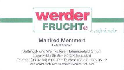 Jana MEMMERT ist mit ihrer Weinkelterei sogar über unsere Landesgrenze hinaus bekannt. Die in Jänickendorf ansässige Familie betreibt in Hohenseefeld eine Süßmost- u. Weinkelterei, die sich in erster Linie mit der Herstellung und dem Vertrieb von Obstsäften, Nektar und Fruchtwein befasst. Im Handel finden wir die Erzeugnisse als „Werder – Frucht“ in 0,2 bis 1 – Liter – Flaschen. Manfred Memmert als geschäftsführender Gesellschafter führt die alte Tradition des Sammelns von Obst in Lohnmoststellen fort und betont, dass es ohne einheimisches Obst auch keine heimischen Fruchtsäfte gäbe.
