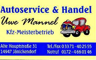 Den Meisterbetrieb finden wir in Jänickendorf, Alte Hauptstraße 51. In der freien Werkstatt, die seit dem 01.02.2002 von Uwe Mannel betrieben wird, werden Autoreparaturen durchgeführt. Aber man kann sein Fahrzeug hier auch zur technischen Überprüfung (TÜV) bringen.