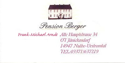 Telefon: +49 (0)3371 63 72 19 Adresse: Pension Berger Alte Hauptstraße 34 14947 Nuthe-Urstromtal E-Mail: zimmer@pensionberger.com Internet: www.pensionberger.com